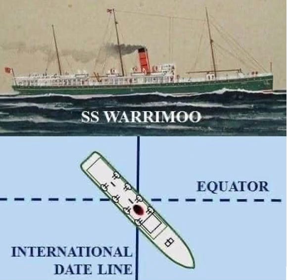 Il tempo calmo e la notte limpida giocarono a suo favore. A mezzanotte la SS Warrimoo si trovava sull’Equatore, esattamente nel punto in cui aveva attraversato la Linea Internazionale del Cambiamento di Data! Le conseguenze di questa bizzarra posizione furono molteplici: