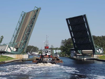 There are many bridges, but the entire ICW is one level so there are no locks, which would significantly slow the journey upstream toward Norfolk, except for just one in the last stretch of the Elizabeth River just before the city.